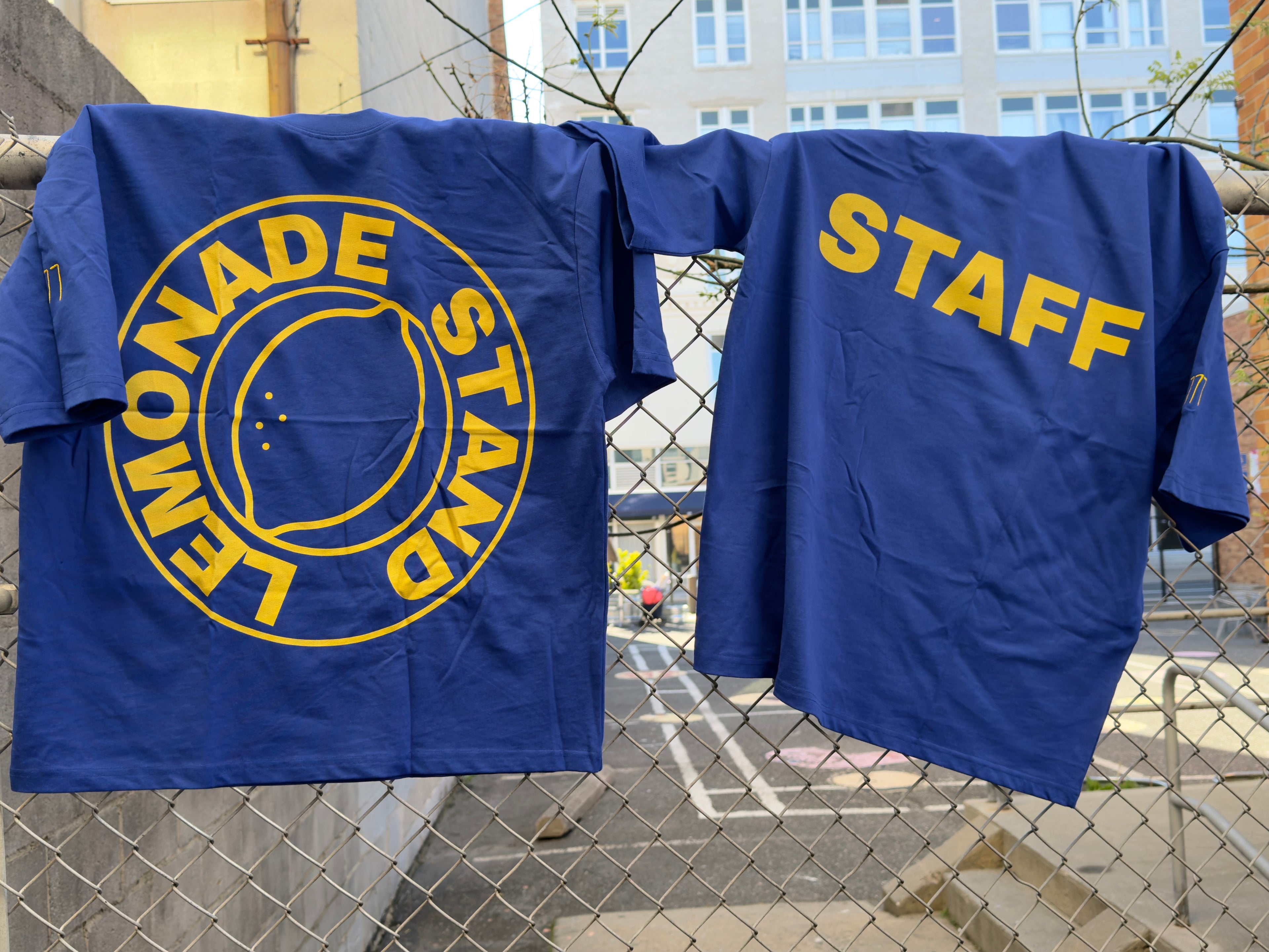 Get your boxy fit lemonade stand tee in honor of the single lemonade (thank me now.) Featuring a LEMONADE STAND logo on the front, a bright STAFF logo across the back and the signature "777" embroidery.